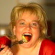 Monica is such a  ... . Last week she bought two pairs of stilletos and three silk dresses that were "half price"!!